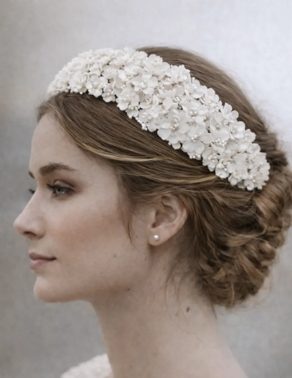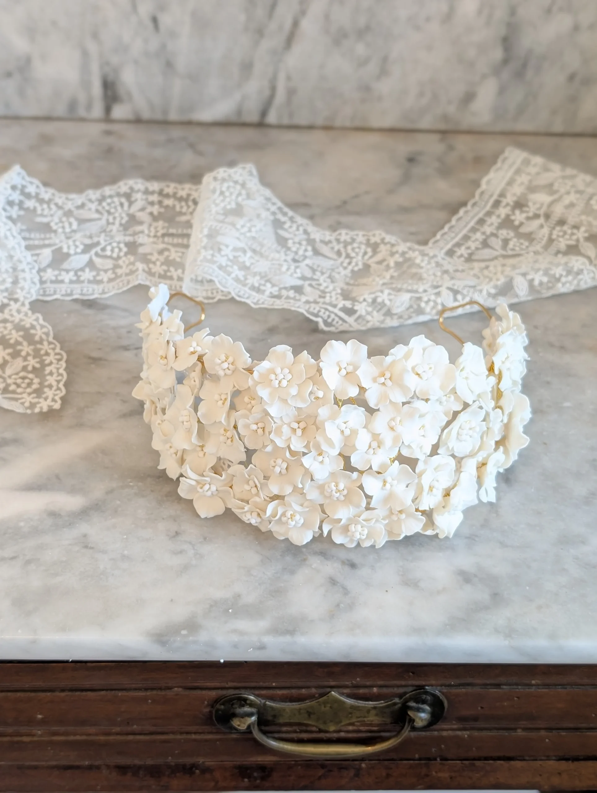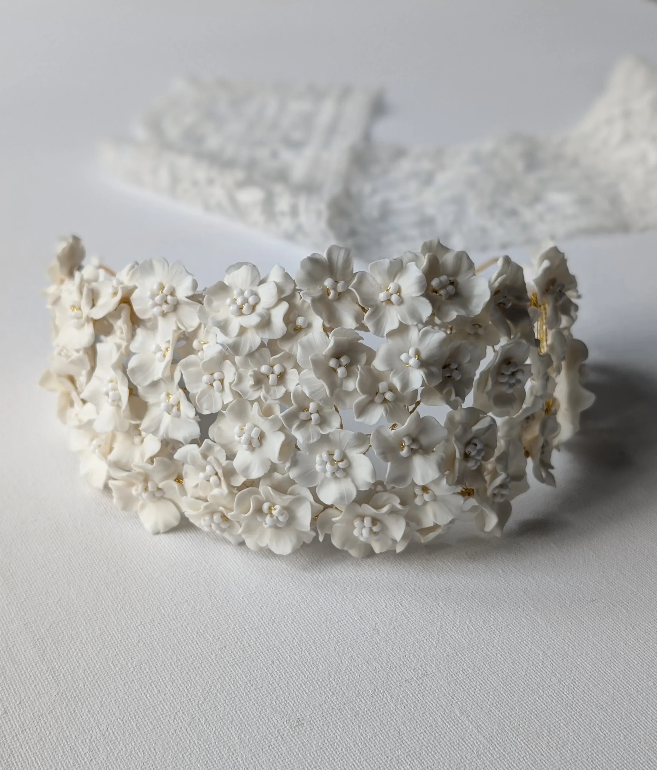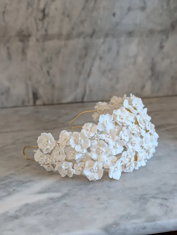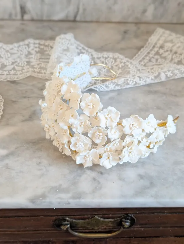Entièrement réalisée à la main, le bandeau de mariage est composée de fleurs en porcelaine froide, minutieusement façonnées une à une pour offrir un rendu d’une grande finesse.
