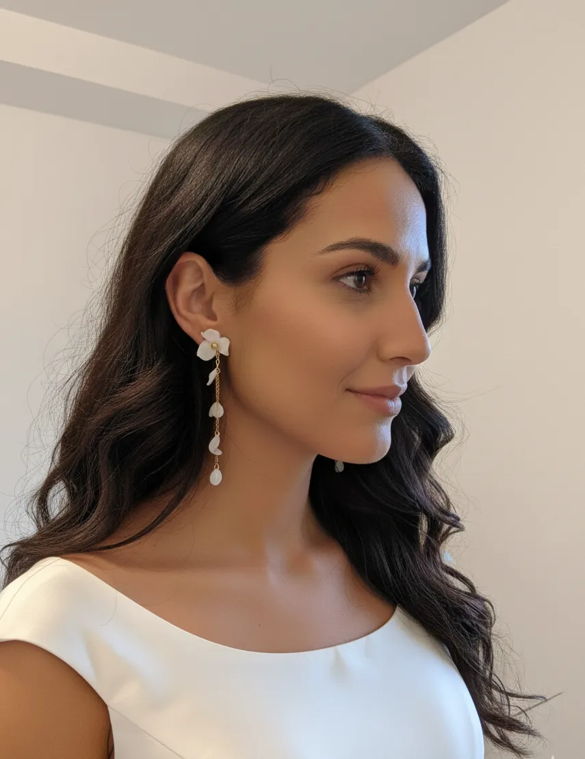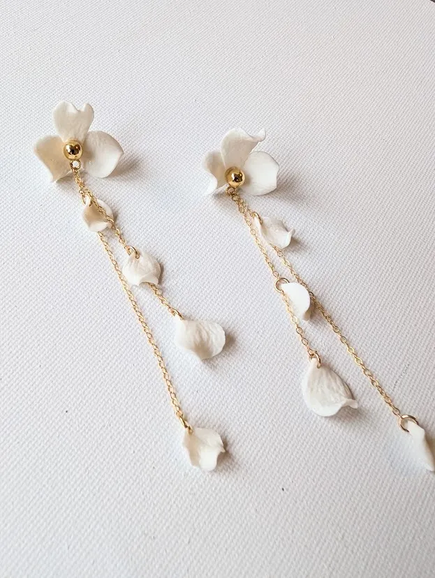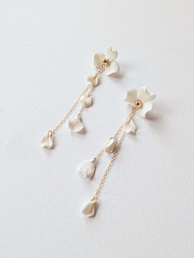 Chaque pièce est unique. Au lobe, une fleur de porcelaine froide apporte une touche organique et raffinée. De cette fleur s’échappent deux fines chaînes dorées de longueurs asymétriques, sur lesquelles semblent flotter de petits pétales délicats.