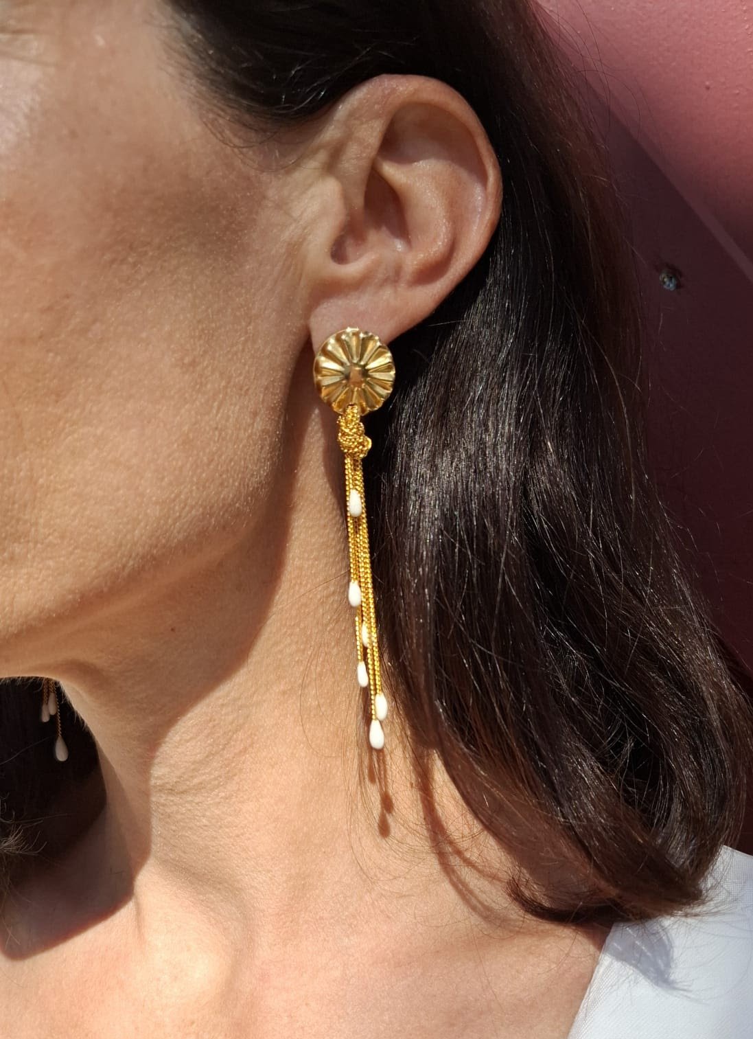 Leur design audacieux se prolonge en une cascade de fines chaînes dorées à l’or fin, à laquelle sont suspendus de délicats bourgeons de porcelaine froide d’un blanc pur. Ces petites terminaisons allongées apportent une texture unique et une luminosité discrète, soulignant l’équilibre parfait entre tradition et contemporanéité.