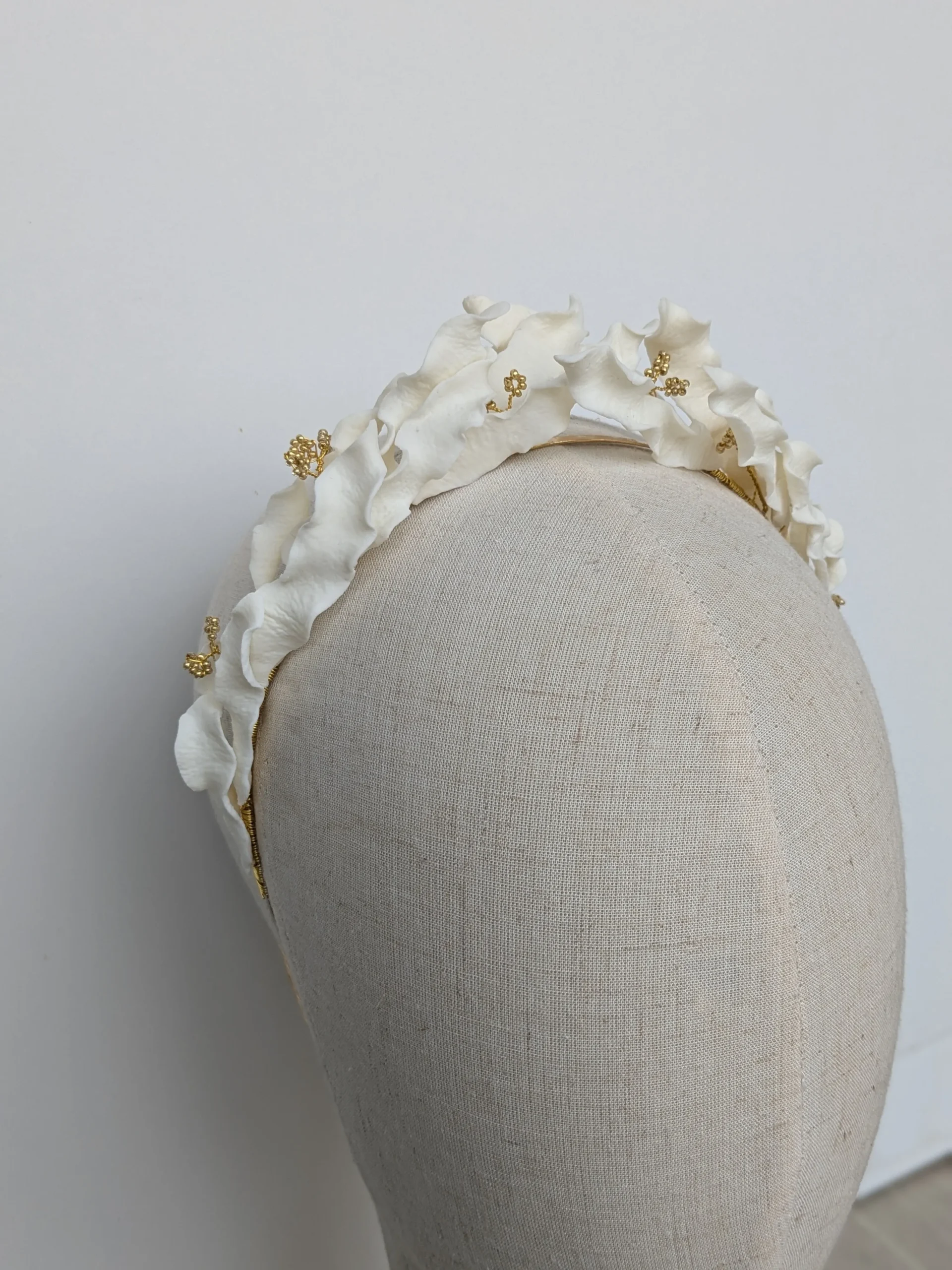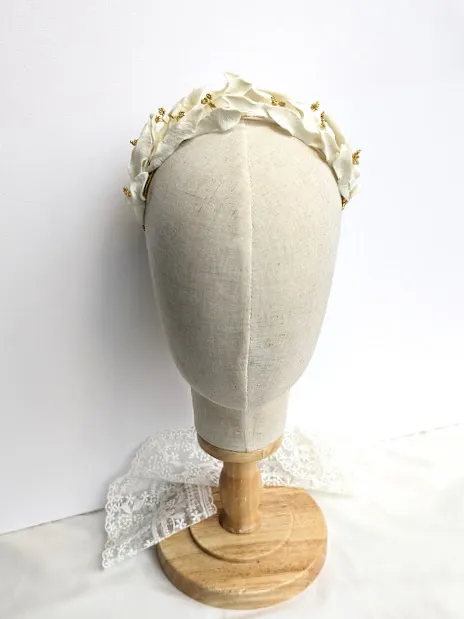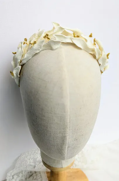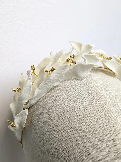 Les feuilles texturées qui composent la couronne sont soigneusement façonnées par mes soins. Les fleurs de perles sont également préparées par mes soins.